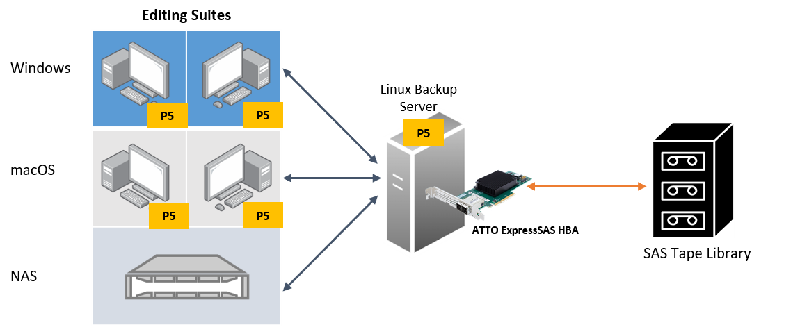 Here are two practical deployment scenarios that show how Archiware P5 works seamlessly with both ATTO ExpressSAS® SAS/SATA host bus adapters (HBAs) and ATTO XstreamCORE® 8100T bridges.