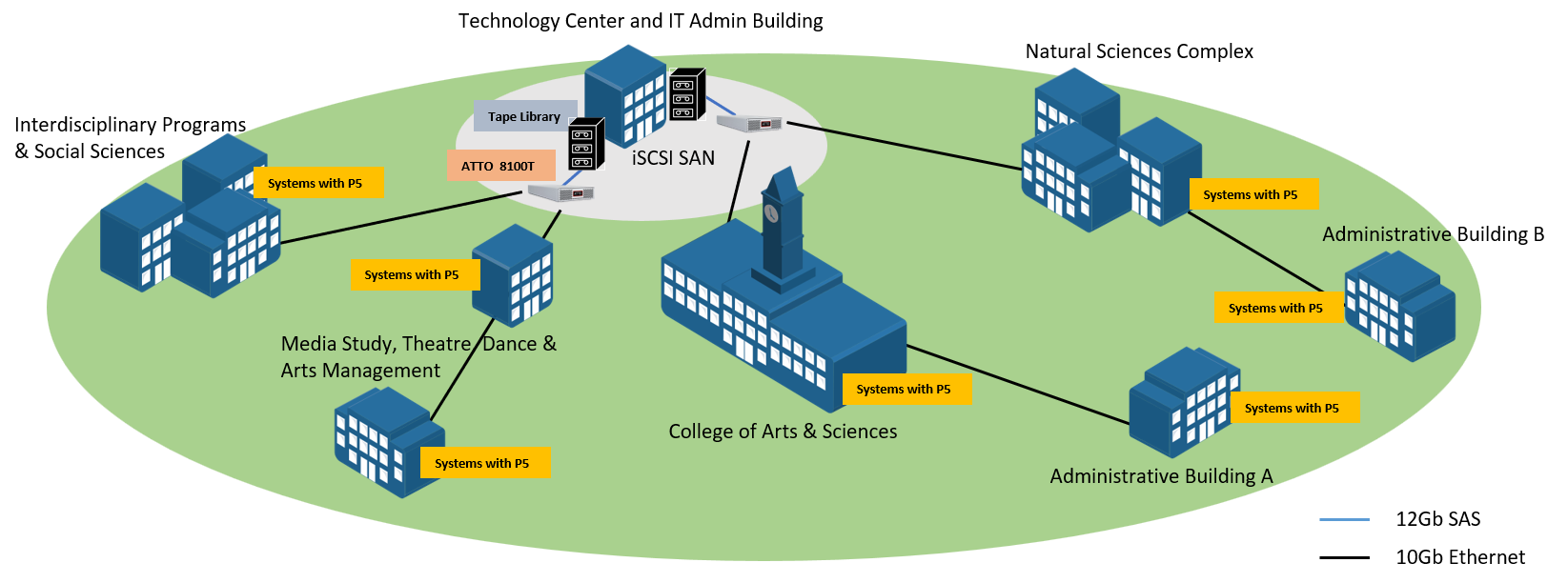 An ATTO XstreamCORE 8100T bridge sits between a SAS LTO tape library and the network, allowing Archiware P5 to access the tape library over Ethernet via iSCSI. Within P5 the tape drives are presented just like any other direct-attached SAS device. Archiware P5’s built-in support for tape libraries and multiple drives, and job scheduling made it easy to manage simultaneous backup and archive tasks from different departments while the 8100T facilitated centralized operation and management of the tape system. The university’s IT department had full visibility and control over all tape jobs, eliminating the need for multiple standalone backup systems or complexities associated with managing direct-SAS connections. This reduced operational overhead and costs and also enabled the implementation of an offline backup strategy aligned with the university’s cybersecurity and risk management policies.