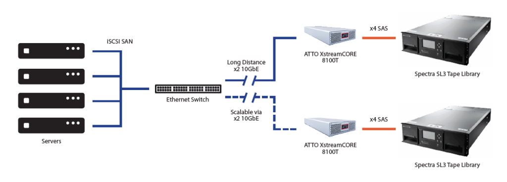 The Spectra Stack Tape Library paired with the ATTO XstreamCORE 8100T bridge connects SAS LTO tape drives to 10Gb Ethernet using iSCSI, allowing multiple hosts to access shared tape devices over standard network infrastructure.